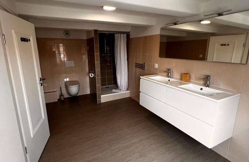 Upstairs, you will discover three additional bedrooms and two bathrooms. The Alsatian-style ceilings, with a height of 2.04 meters, typical of the region, add a warm atmosphere. Two of the bedrooms are equipped with Queen-size beds and share a bathroom with a shower and double sink. The third bedroom, measuring approximately 30 square meters, includes a large bathroom, a desk, and a reading area.