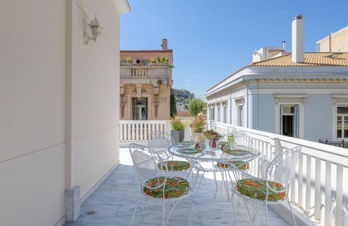 Maxalto couch providing uttermost comfort. The spacious living room consists of a 50 inch TV, a dining table seating eight people, a comfortable couch and two big armchairs with plenty of space left. There are four air conditioned bedrooms with nice decorated wallpapers matching the tone of each room. One modern bathroom has a walk-in shower head and the other bathroom is made from marble keeping its old essence. All rooms are open to the terrace, where the Acropolis view