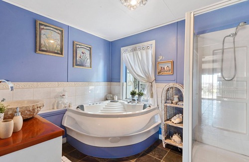 The master bedroom has a large covered balcony with table and chairs which overlooks the gentle rolling valley below. This is a great place to sit enjoying a bottle of wine or an espresso coffee while you watch the sun as it dips behind the trees in the evening, or perhaps that late breakfast after a great night's sleep.