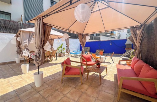 We redesigned the interior to make it more welcoming and sophisticated by painting the bedroom walls in a varied colour palette and recycling furniture from antique shops. The result is a fresh and vibrant space, which remains true to the overall modernist aesthetic. Named after the quintessential tropical flower "Bird of Paradise", it is a conscious retreat from the big city that reminds us to live life in joy and freedom, always true to our purpose. The house is conveniently distributed over two floors; on the ground floor there are the common areas and the kitchen, while on the upper floor there are 4 double bedrooms with artistic finishes and a full bathroom. Two of the rooms have a double bed and have been designed for couples; one is elegantly decorated with touches of gold and dove grey, while the main wall of the other has been painted with a thick striped pattern of white and indigo, a much more relaxed style. Both share a large terrace overlooking the front yard of the house with a surprise! A chill out space with an 8-seater dining table to celebrate an outdoor brunch or dinner under the stars. On this same level, on the other side of the house, there are 2 other bedrooms, each with 2 single beds, perfect for children or adults traveling together, but separate. You can choose between kelly green and magenta, that's the only difference between them. Both have large windows that allow sunlight throughout the day, as well as custom ceiling lamps and suspended wall coat racks. We wanted all the rooms to be unique and original and that's why we decided not to place the usual closets. Separating the double bedrooms from the single bedrooms is a full bathroom that opens onto the stairs leading down to the first floor. Here there is a dining room on one side and the kitchen and living room on the other. For this renovation, we naturally kept items that were in fairly good condition, such as the TV console, the hall sideboard and the bedside tables, so that we could restore them while capturing our personality in them. This is most evident on the ground floor, where we have kept the modernist patterned tiles on the walls as well as the trapezoid-shaped tiles on the stairs. The dining table can seat up to 8 people on vintage French chairs, purchased from a local stall that has closed its doors. Be sure to look in the mirror before sitting down at the table! Mirror, mirror…….which door do you open? This room opens directly onto the patio with artificial grass, Sitges blue walls and bamboo furniture. It is undoubtedly the best place to hang out with family and friends, as it includes a barbecue, a ping pong table, sun loungers and an outdoor shower. Under the shade of the pergola, the warm summer days, when the sun shines overhead, will feel as light as the sea breeze. Outside, sheltered by the upstairs terrace, there is also a storage room with a washing machine and a bathroom with a shower. Back in the dining room inside the house, we find two armchairs and a coffee table, the perfect combination for playing cards or sharing a drink. We haven't updated the kitchen, but we have included all the necessary appliances of modern life: microwave, fridge/freezer, dishwasher and some extra storage. We added a vintage vinyl rug to continue the aesthetic of the rest of the rooms. Finally, just off it is a living room with a large TV screen and two sofas, one of which is also a double bed. All in all, it's a much more intimate place for overnight guests as well as a fabulous movie room. Ave Paraiso is a traditional 4-bedroom Mediterranean home with an American shabby chic feel influenced by the owners' background; each room will surprise you with genuine details and restored furniture. With central air conditioning and heating, the house is open all year round for travelers who will be able to find street parking. Main features:- Maximum guests: 10