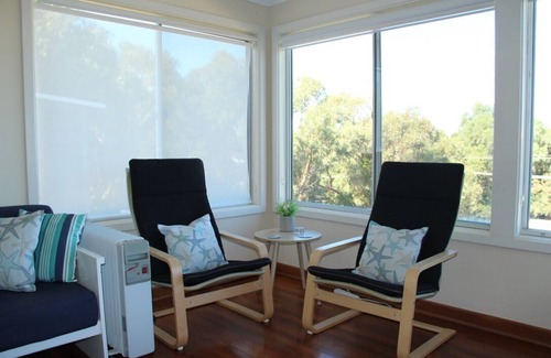 The large open living area has large windows, dining, lounge and sitting spaces. Bedroom 1 has an ensuite bathroom. The rear verandah area is protected and has a BBQ and seating. The shared bathroom is combined with the laundry.