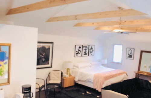 3. Detached residence-inspired suite; 500sqft, smoke-free, 1 king bed, shower, sofa, table, hair dryer, coffee maker / tea, washing machine and dryer, mini-refrigerator, cathedral ceilings, concrete floors, two sets glass double doors, located in rear of property.