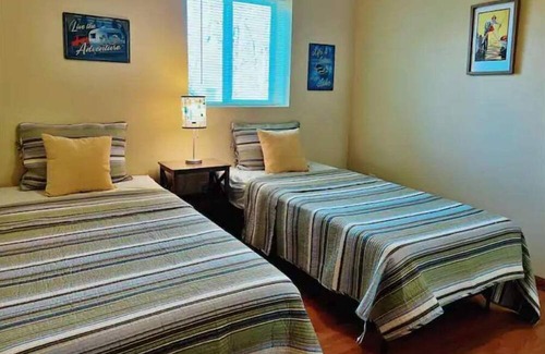 The home sleeps a total of five people and has 2 bedrooms. One bedroom has a queen bed. The second bedroom has two single beds. In the living room there is a memory foam futon that sleeps one.