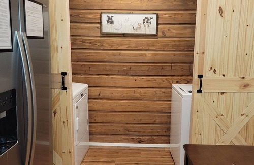 The Bunkhouse is a 2 bedroom, 1 bath cabin with a fully equipped kitchen and laundry room. Decorated in a cozy farmhouse theme with games and crafts for families and couples.