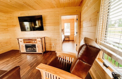 The Caribou Cabin is perfect for families and group travelers, offering comfort and convenience by a peaceful half-acre pond. It accommodates up to 6 guests with two queen bedrooms and a queen pull-out couch in the living area. Enjoy a full kitchen, coffee bar, washer/dryer, and a cozy gas-powered fireplace.