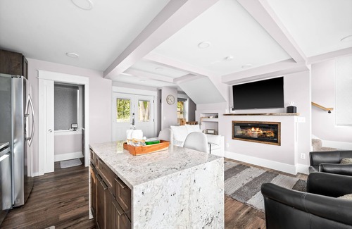 The master bedroom is located on the upper floor and is outfitted with comfortable and luxury class king size Stearns and Foster mattress for a restful night's sleep on a modern platform bed. The master bedroom has a full bathroom and TV. For additional sleeping arrangements, there is a pull-out couch located in the lower level.