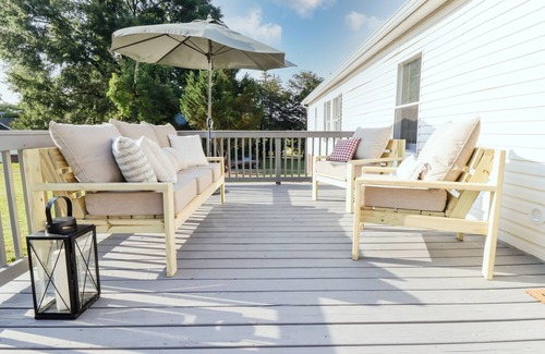 INDOOR LIVING: Open layout, upscale and newly renovated, breakfast nook with seating, 65” flat-screen Roku Smart TV in the living room, 45” flat-screen Roku Smart TV in the primary bedroom, large dining table, big sofa sectional, board games