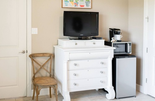 Both casitas feature a 42” smart TV and a kitchenette equipped with a mini-fridge, microwave, and Keurig coffee maker.