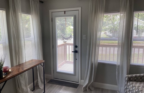 This modern chic charm offers 2-bedrooms (2 Q-beds), 1-full bath and sleeps 4. The open floor plan highlights the entertaining chef’s kitchen with stainless-steel appliances, and a high-low countertop & bar which provides additional seating for entertaining with pocket-door access to a stylish, fully functioning laundry room. With a dedicated working space, the office/sitting room is enclosed with double barn-doors and massive natural light that walks out to a wrap-around deck for cocktail or mocktail hour with dual entry points to the side fire chat section and backyard.