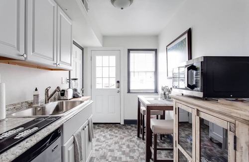 When guests enter the first floor, they'll find a living room with a large flat screen TV and a sofa. Beyond the living room is a bedroom with a Queen bed and TV. There is also a small room off of this room with a trundle bed. The trundle bed has one twin on top and one pull out twin below. Also, from there you'll find a hallway leading to the kitchenette and full bathroom. The kitchenette has a sink, microwave, Keurig coffee maker, and mini fridge. There is also a small table for two! The full bathroom has a shower/tub combo, pedestal sink, and toilet. Next to the bathroom is a 2nd bedroom with a queen bed and closet.