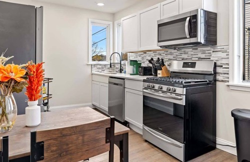 The home has 4 bedrooms and 3 bathrooms. It features three spacious bedrooms with a comfortable queen-sized bed, plenty of storage, and natural light. The fourth bedroom is very small and has a futon. The futon can sleep 2 people (it can sleep 2 people but not 2 large people). The bedrooms are thoughtfully designed with soft linens, plush pillows, and beautiful decorations!