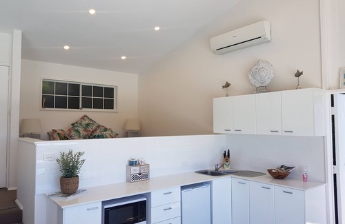 A quiet and beautiful self contained split level bungalow with pool and ocean views. Kitchen and other cooking amenities include; bar fridge, microwave, sunbeam frying pan, electric 2 burner hotplate, kettle, toaster, sandwich maker and coffee machine. Please note, there is no oven and no dishwasher. There are no laundry facilities at The Copa Cabana.