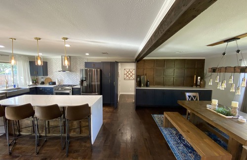 The Corner House is a charming home updated to perfection with an open concept and plenty of bedrooms and bathrooms to give guests privacy, while still affording them the opportunity to spend quality time together in the living, dining and outdoor areas. The home is a 5 bed/4 bath with plenty of parking. Centrally located just of 635 in a safe and quiet 1960's style neighborhood, allowing for easy access to almost all areas of DFW.