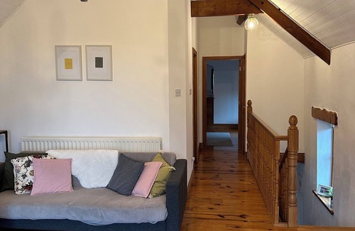The Corn Mill has a first floor living space with a large window to view the surrounding countryside and vaulted ceiling. The primary bedroom features a king size bed and is on the first floor. The second bedroom on the ground floor features two single beds and has an en-suite (toilet, basin, and shower).