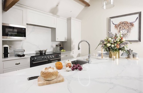 Inside, the atmosphere is one of warmth and elegance, with neutral tones and natural textures creating a space that feels both homely and inviting. Sumptuous soft furnishings and modern features adorn the rooms, and an atmosphere of airiness pervades throughout thanks to high pitched ceilings, wide windows and exposed roof timbers. At the heart of the home, the open plan living / cooking / dining area with its fabulous wood-burning stove, creates a convivial space for spending time together with family and friends, whether lounging across the sinkable sofa in front of the television, chatting over coffee at the breakfast bar while whipping up a full English, or converging round the farmhouse table for a home cooked evening meal. Two beautiful ground floor bedrooms (one with en-suite) have deliciously comfortable beds as well as their own access out to the garden, while upstairs via the home’s chunky oak staircase, lies a third spacious bedroom with a plush, upholstered sleigh bed and double volume ceiling.