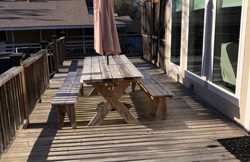 The upstairs is surrounded by a 10' by 40' deck with a picnic table, with benches, as well as a 12' by 20' screened porch with a swing and porch table and chairs. There is a gas grill stored on the screened porch, which can be moved onto the open deck for use. Entering the upstairs, you will find a living room with a panoramic view of the back yard, creek, and boat landing. The living room also sports a free-standing gas log fireplace for your enjoyment and ambience, a smart TV, two swivel rockers, and a reclining loveseat. A bar, seating 3, separates the living and dining areas. A dining table, seating at least 9, is located behind the bar. A fully equipped kitchen includes granite countertops, gas range, refrigerator, microwave, dishwasher, toaster oven/air fryer, blender, Keurig coffee maker, and a small basket-style coffee maker. Upstairs also includes 3 bedrooms and 2 full baths. The master bedroom has a king bed, walk-in closet, and ensuite bath. A second bedroom has a king bed, closet, and shares a full hallway bath with the third bedroom, which has a queen bed , a chest of drawers and closet.