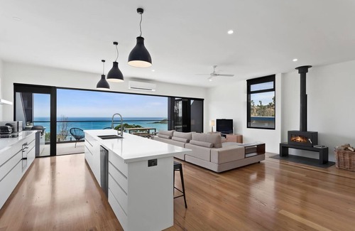 Venture upstairs to find an expansive open-plan living area, where the entire width of the building frames a breathtaking ocean view. This bright and airy space integrates the living, dining, and kitchen areas, all infused with a sense of warmth and comfort. A wood fire, large comfy lounge suite, and touches of timber enhance the homely feel.