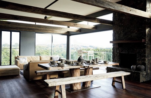 The Dairy is a luxe country home which sits on a ridge overlooking the magnificent valleys of the hinterland . It’s only 20 minutes from the hustle and bustle of Byron Bay, 15 minutes from the beaches of Lennox Head and the quaint villages of Bangalow and Newrybar and only a 10 minute walk to Killen Falls. The Dairy building was inspired by the old Dairy bails on the property which have been restored and act as your outdoor entertaining area. The new Dairy building has a moody vibe and an indoor, outdoor feel. The magnificent hinterland views surround you through large windows in the bedrooms and huge glass bifold doors in the living areas. Moody decor, original artwork and luxe furnishings provide the perfect viewing platform to track the path of natures day. Cloudlike beds dressed with high quality linen take your luxe experience into the evening. A stone fireplace and bespoke two person concrete bath ensure you’ll be cosy even when the weather isn’t.