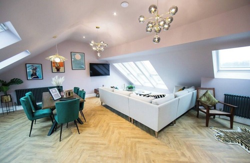 Indulge in luxurious living with our stunning 3-bed, 3-bath penthouse suite in the heart of Buxton. Boasting a brass bathtub and opulent decor, this top-floor retreat provides the perfect escape for families and groups of friends looking to explore the Peak District in style.