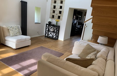 The Dovecote is an elegant peaceful cottage, set in a garden of a medieval Manor. In Tudor times the Dovecote providing doves to the Royal Palaces Today, the dovecote has undergone extensive restoration, converting it into a charming living space, with modern facilities and fast Wifi. Now it's ideal for different purposes from a relaxing getaway, to a home from home for a business traveller or a quiet space to study. The Dovecote has a modern kitchen with dining table.The Dovecote is set away from the Old Manor and is accessed by a footpath, which leads through a small rose garden with a medieval well, which has been converted into a fishpond. You might see some of the doves flying about, who have lived here for over 500 years. You enter the Dovecote through a set of double doors, into the modern kitchen/dinning room; which is equipped with; an electric cooker, hob, dishwasher, toaster, microwave and plenty of cupboard space. Off the kitchen is large shower room with a loo and basin, which is stocked with soaps and shampoo. The kitchen leads onto a light and spacious sitting room, with alarge comfortable sofa where you can watch a film on the 52” television. Above the sitting room is located the gallery double bedroom. Which has an ornate king size bed, from you gaze up at the ancient oak beams. The property is served with fast Wifi through out and central heating. Although the Dovecote only sleeps 2 guests, a single bed can be requested at the time of booking which would be placed in the corner of the sitting area to provide 2 separate sleeping areas within the property.