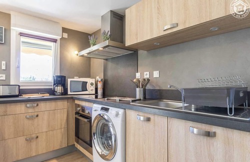 Gîte on the ground floor of the owners' house. Level access. Living room-kitchen-lounge area, flat screen TV + DVD player. Integrated and equipped kitchen. Shower room (large shower, thermostatic fittings, electric towel rail). Independent WC. 2 bedrooms (1 double bed 140 x 200 cm, memory foam mattress, flat screen TV / 1 double bed 140 x 200 cm, memory foam mattress). Free WIFI. Sheets included + beds made. Linens provided. Private terrace with electric removable awning, private garden. Barbecue. Garden Lounge. Access to the owners' pool (according to timetables). Private parking within the grounds of the property. Weekend on request at certain times. Contemporary villa in a quiet residential area near Lac du Bourget (2.5km). Ideally located near Aix-les-Bains. Immediate environment of quality. Easy access to the lake. Very good comfort. Qualitative furniture and appliances giving a warm contemporary character to the cottage. Pleasant private exterior.