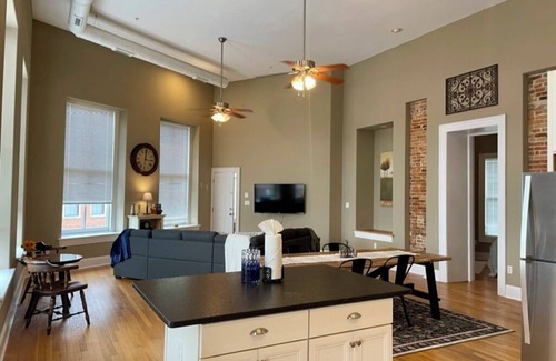 Welcome to The Drinking Gourd...a freshly renovated 2-bedroom penthouse in the heart of the historic downtown district of Cambridge. With its exposed brick walls, 15 foot ceilings, antique brass fittings, and original mahogany millwork, this condo offers a stunning historic setting while being a super cozy and fully-stocked haven for guests. The bedrooms feature all new beds and linens, including a king bed, full bed, and comfie expandable sectional bed. The bathroom boasts a relaxing bathtub as well as full-size washer and dryer. In the lofty open-concept living room space you'll find a roomy sectional sofa, large screen Roku-enabled TV, and a built in reading nook...perfect for lounging or accommodating extra guests. The kitchen is fully stocked with everything you'll need should you want to indulge in cooking some of our outstanding local seafood. There are also lush linens, plentiful paper products and toiletries, and books, games, and toys for all ages. You'll be situated in the heart of the Underground Railroad, with the fabulous pubs, galleries, and boutiques literally right outside your door. The City Marina is only 4 blocks away, and the Blackwater Wildlife Refuge is within a half hour's drive. We pride ourselves on creating inviting and cozy homes-away-from-home in historic locations...come discover fabulous Cambridge!
