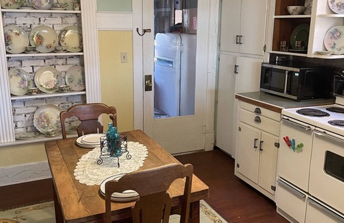 The Egret’s Nest is a beautiful unique Antique home full of character and amazing details. The vintage kitchen has a hand painted rug under the table.. looks like a little art museum. The home is cozy and a great place to relax to wind down the day. The front bedroom has a hand painted ceiling with amazing eye catching detail. The corners have hand painted Egrets that inspired the name “The Egret’s Nest”. The home is located right in town.. easy access to restaurants, stores, and the Mammoth Spring State Park.