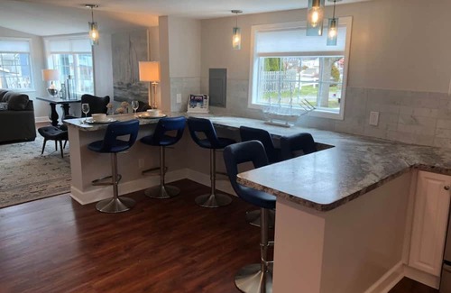 This BEAUTIFUL 3-bedroom, 2 bathroom open concept house offers peace and privacy along with the convenience of being just steps from the water!The Ehmann House is one of our larger propertes, and is perfect for those guests that enjoy the nicer things in life. Larger groups are no problem in this open living area, with hardwood floors, beautiful comfy couches, chic electric fireplace and 55” flat screen smart TV. If you need more space to spread out, wander through to the second sitting area furnished with plush chairs, where you can watch the boats on the water out of the large picture windows. A round glass top table with soft cushioned chairs is nearby for meals, hot cup of coffee or a game of cards. The Ehmann kitchen is perfect for whipping up dinner for a crowd or crew, as it is fully stocked right down to the spices. There is a large custom built-in bar with 8 bar stools. Stainless-steel appliances accompany the beautiful cabinets. White subway tiles, custom designed counter tops and breathtaking artwork make this kitchen one you’ll remember. When you’re ready to snooze, this home has sleeping for eight between the three bedrooms and couches. The Ehmann master bedroom is a large grey and teal colored spacious spa-like room furnished with a queen-size bed, dresser and beautiful relaxing chairs. This master bedroom has the convenience of en-suite bathroom with a double granite vanity, and a tiled walk-in shower. The second bedroom, with two high post twin-size beds is serene with breathtaking artwork and a large overstuffed chair. This makes it the perfect place to curl up and relax with a book. The third bedroom at the Ehmann is a fabulous green and white room with two twin-size beds. Seating, plush bedding and beautiful artwork finish this bedroom to make it a restful place to lay your head. Two large, full bathrooms with showers, separate laundry room with a full-size washer and dryer, chest freezer for your catch of the day, and plenty of off street parking are just some of the added benefits you will find at this vacation haven. In the evenings, enjoy this home’s private deck and yard and watch the sun set .You can enjoy an outdoor meal on the charcoal grill or gather in chairs around the fire pit. So many comforts you may never want to leave. We can't wait to host your stay!
