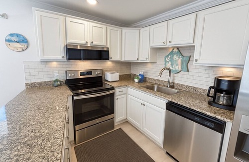 THE CONDO - This wonderfully remodeled 2 bedroom, 2 and 1/2 bath condo can sleep up to six guests. Downstairs, you will find a fully equipped kitchen, as well as a half bath with a full-sized washer / dryer. The living room entertainment center includes a large flat-screen TV with 100+ cable channels and DVD player. Feel free to bring your devices for the occasional cloudy day and use the dedicated WIFI modems both downstairs and upstairs for added WIFI connectivity! A generous supply of games and books are available if you need some downtime after a busy day at the beach. Put your feet up and relax on the brand-new sofa which converts to queen sleeper.