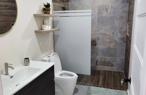 Guest have access to a full bathroom, living room, a fully equipped kitchen with a washer dryer combo.