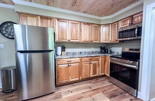 The fully stocked kitchen has a standard drip coffee machine, pots/pans, cookware, bakeware, 5 burner electric stove and oven, full sized refrigerator and beautiful new cabinets!