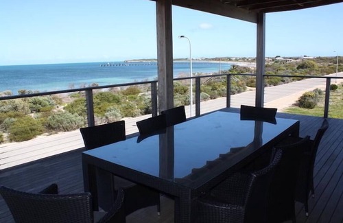 The Esplanade has to be one of the best holiday home rentals in Marion Bay. Come and enjoy the almost 360 degree views of full ocean frontage from Hillocks Point to Kangaroo Island to the Marion Bay Jetty and Penguin Point. This two story house right on the beach front with its huge 2nd story balcony through to a gorgeous large bright lounge, dinning and kitchen area. This House has everything you can ask for from absolute beach frontage ,Spectacular sunrises, just meters from the beach .It has 2 entertaining areas one upstairs and one downstairs, three bathrooms and four bedrooms,double shed parking. Perfect for two families or even couples seeking absolute privacy and indulgence.