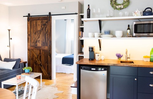 Our farmhouse suite is open and filled with natural light; it is located on the east wing of our farmhouse. It has its own private entrance as well as a back door that leads out to our communal fire pit, garden and newly-planted food forest. It has wood floors and counter-tops, bright windows and a wood-burning stove.