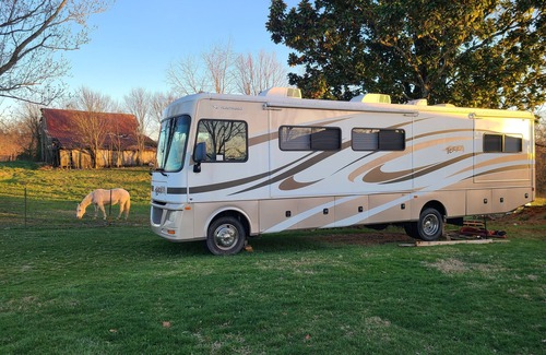 Conveniently located 3 miles off I-81 at exit 50 & close to Kingsport TN, enjoy your stay in a 33' long motor home located near our home. Great for a stop along the way, a local event/festival, easy weekend glamping, or a contract job in the area. It has a private bedroom with a queen size bed, bathroom w/shower, living room with a full-size convertible sofa/bed, a dinette that converts to a bed, a reclining chair, and a fully equipped kitchen. It's a bit of country living on a working farm.