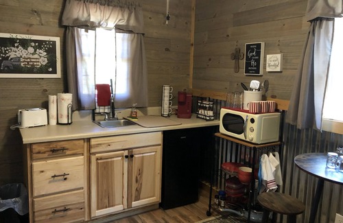 This cabin has been decorated in tin and ship lap with colors of golds, browns and tans. The fire cabin offers a rustic wood queen size bed with a bedside table and lamp. A table with two chairs. Two ceiling fans. A mini split that offers heat and air. A separate bathroom with a shower, sink and toilet. A double size futon bed for an extra guest and end table with lamp. The kitchenette comes equipped with a sink, retro microwave, toaster, keurig coffeee pot. We furnish the k-cups. A two burner hot plate for cooking. A medium size refrigerator. Cookware, dishes. We offer all of the linens, quilts, blankets, pillows, towels and wash cloths, toilet paper, trash bags bath wash. All the cabins have a porch with a bench, a campsite grill and picnic table. There is a shared fire pit with nine chairs to roast your marshmallows and make s’mores. (We offer a 1 free complimentary bundle of wood) You will need to purchase your own wood after that. Please bring lighter fluid and charcoal for your outside grill.