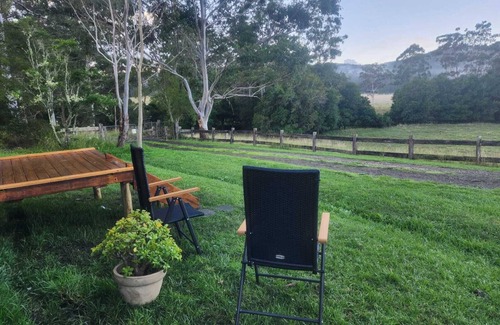 Escape to The Fog Getaway 1 by Tiny Away, a tiny house NSW retreat boasting mountain views, lush greenery, and a tranquil pond with ducks. Where you can enjoy farm life with sheep, cows, and free-roaming chickens, close to cafes, restaurants, and an IGA store. With beaches and Tea Gardens' exquisite riverfront dining options for you to explore.