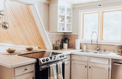 The breakfast bar and kitchen open up to a living and dining area flooded with natural light and an easy-to-use gas fireplace. The open living and dining area offers a leather sofa, Bluetooth soundbar, and TV equipped with AppleTV to login to your streaming services (no cable). There is plenty of seating, pillows, and blankets to get comfy whether you choose the hanging egg chair or a seat in the reading corner.