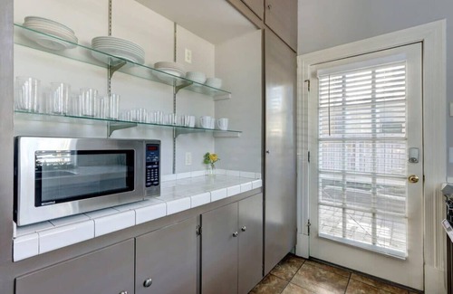 Immerse yourself in the rich history of the space, from the original fireplace to the gleaming hardwood floors and lofty beadboard ceilings. After a day of exploring the city, sink into the comfortable sofa and unwind with your favorite shows on the wall-mounted TV.
