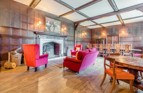This large country hall rests in Pitchford, near Shrewsbury, Shropshire and can sleep fourteen people in seven bedrooms.