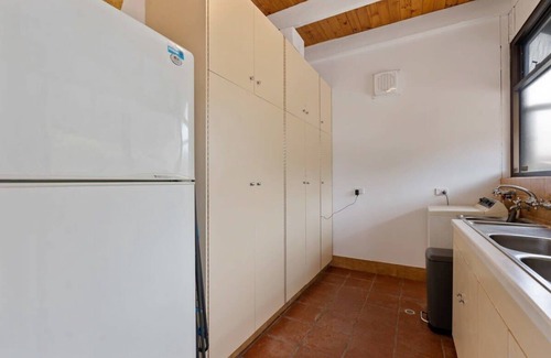 The laundry off the kitchen has the fridge, washing machine and cupboards.