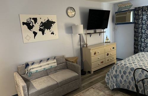 Newly renovated studio condo, fully furnished. Balcony w/beach view. Across the street from the beach. Not in loud part of Beach. Minutes walk to the ballroom and other attractions. Many amenities. One free parking space, on street paid parking. It has a queen bed and a single pullout. A great escape 🐟🐠🦞