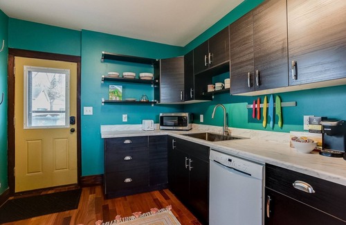 This modern box was once the local neighborhood grocery store and features tall ceilings, beautiful woodwork, craftsman built-ins, and was converted into a homey boho style home for the vacation rental traveler.