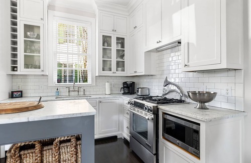 The fully stocked kitchen is a chef's dream, featuring exquisite marble countertops and top-of-the-line Jenn-Air appliances, allowing for an effortless cooking experience. Enjoy your morning routine with the convenience of a Keurig coffee maker, complete with complimentary coffee and tea to help you start your day on the right foot.