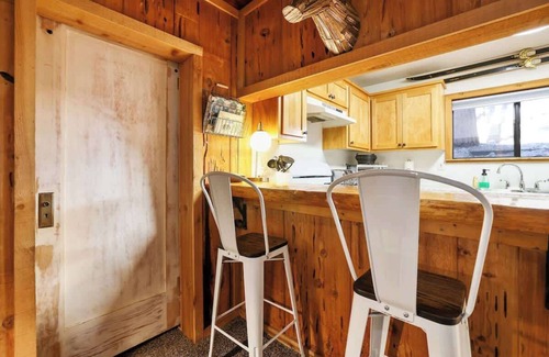 An original Shaver Lake cabin, The Hideaway is quaint in size, with one main living space, two small bedrooms, a fully equipped kitchen, dining space, and bathroom. You'll love hanging out in the mountain air outside on the upper and lower decks, around the fire pit, BBQing, and hanging out at the picnic table under the cafe lights. The fireplace inside is easily workable with an on/off switch and heats the whole cabin! The cabin is a quick 5-minute WALK to town, easy for any ability level- from kids to grandparents! Right behind the cabin, you'll find a small stream in the spring and summer, and a hill perfect for sledding and snow play through the winter months! 5-10 minute drive to the lake, 25-30 minute drive to China Peak Ski Resort. Parking for 1-2 cars and a boat in the summer.