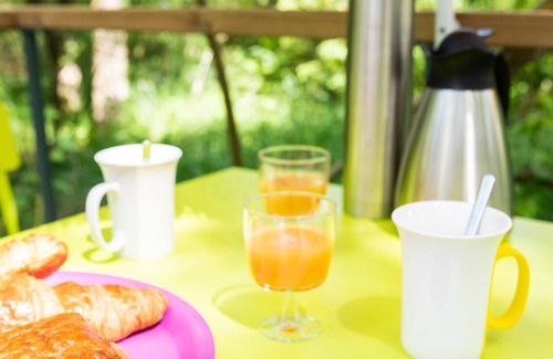 Tipi 3x3 meters (9m²) on a wooden terrace of 24m² with double bed, bedside table, dry toilet, solar water point (hand wash), 1 USB socket, solar outdoor lighting, 1 table and 2 chairs outside aperitif dinner with 1 drink included breakfast included In case of alert weather alert ORANGE declared by weather France the reservation will be automatically canceled for the safety of all.