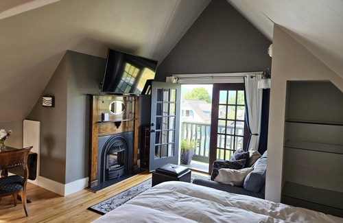 The Loft Studio is the top floor apartment and enjoys expansive views towards the harbour, water, and North Shore mountains with a Juliette balcony to take advantage of the scenery. The room is self- contained and has a fully equipped kitchen, including a dishwasher and microwave. The Loft features a lovely antique gas fireplace, queen size bed, air conditioning, large flat screen TV, WIFI and cozy couch which looks out over the views. Light abounds with vaulted ceilings, sky lights, cream colored wood floors and there is space to work at an early 1900s writing desk discreetly tucked in a corner. A large hall closet has plenty of room for your suitcases and clothing. The Lofts bathroom has heated tile floors, a clawfoot tub and a walk-in shower. Seating on the front porch and front garden is also available for guest use. It should be noted that this studio is located on the third level of the house. There are three levels of stairs to reach this room, including the front stairs into the house. The Loft was originally named for its views across the water to the Lions Mountains in the distance.
