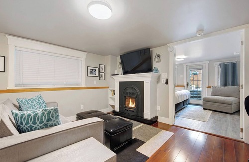 The Retreat at The Ivy on Parker is a comfortable self-contained apartment, perfect as a home away from home, whether for short or long term stays. The Retreat features a separate ground level entrance accessed via our perennial gardens. Entrance is through the bedroom that features a king size bed with luxury linens, air conditioning and French doors leading into the living area. Hardwood floors, a gas fireplace, a desk with a comfortable workspace, flat screen TV, WIFI, and private in-unit laundry facilities are all part of the luxury found in The Retreat. A full gourmet kitchen has every amenity, including a dishwasher and microwave, lots of storage and counter dining seating. The spacious bathroom features a heated tile floor, clawfoot tub and separate walk-in shower. Seating on the front porch and front garden is available for guest use.