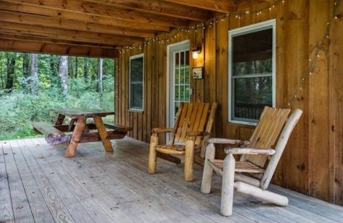The Kokosing at The Mohicans Treehouse Resort is our cozy upscale rustic cabin including 2 upstairs bedrooms, full bath, living/dining area and kitchen on the main floor, radiant heat floors, ceramic tile shower and granite counters. All details of this well-appointed cabin reflect the warm feel of the Mohican area. A large covered front porch invites you to relax and unwind. There is even a outdoor shower for the summer months.