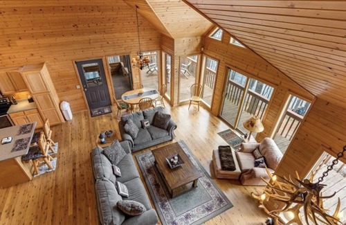 Magnificent 3000 sq ft lake home featuring 4 bedrooms, 3 bathrooms, private lakefront dock, gourmet kitchen, great room, basement, large deck, screened in porch with BBQ & fire pit, 2 fireplaces, AC, high-end furnishings, appliances, and home entertainment.