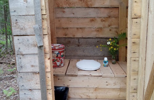 There is an outdoor shower with a hand held water pump and an outhouse behind the cabin.